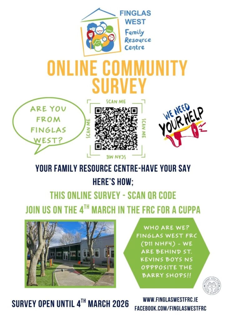 Proudly serving your community – please scan the QR code or click the link to complete our short Community Consultation Survey. Please share with your family, friends and neighbours based in Finglas West!! Survey will be open online until 4th March https://forms.office.com/e/RZzM1AKY0J
