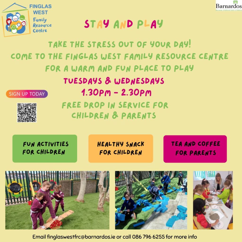 Few places still available for our Wednesday Stay & Play group here in Finglas West Family Resource Centre. This free term time group is for junior and senior infant age groups and runs weekly for parents and children to stop in 1:30 to 2:30 – healthy snack and fun activities/crafts provided for the children. Places are limited so sign up today!!